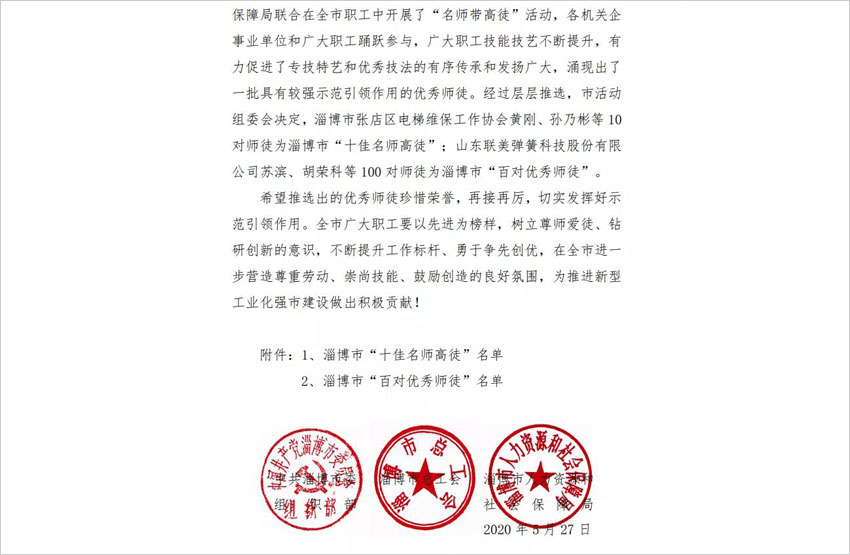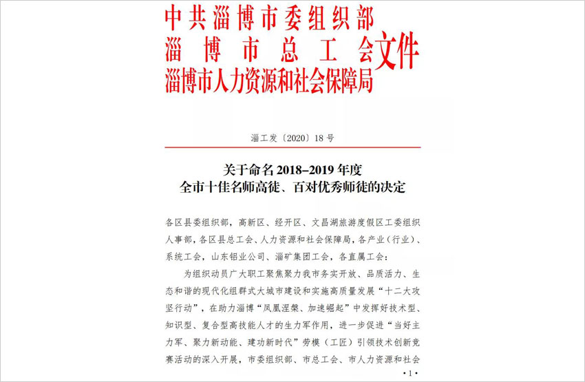 近日,中共淄博市委組織部、淄博市總工會、淄博市人力資源和社會保障局聯合發文,命名表彰2018-2019年度“全市十佳名師高徒”、“百對優秀師徒“。